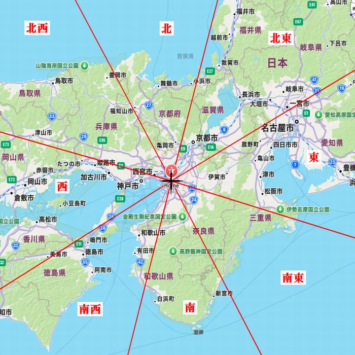 基本は自分の、現在今住んでいる所が中心となり、そこからの旅行先がどの方位にあたるかを調べます。